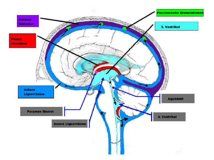 Die Hirnwasserkammern werden auch als Ventrikel bezeichnet. Es handelt sich dabei um "Hohlräume", die sowohl im Großhirn wie auch im Stammhirn vorkommen. Diese Ventrikel sind mit einer wasserähnlichen Flüssigkeit (Liquor genannt) aufgefüllt. Man unterscheidet grob vier verschiedene Ventrikelteile: Die symetrisch angelegten Seitenventrikel befinden sich im Großhirn. Der III.Ventrikel befindet sich im Übergangsbereich des Großhirns zum Stammhirn (Thalamus, Hypothalamus). Er ist mit den Seitenventrikeln durch zwei kurze enge Röhren (Foramina Monroi) verbunden. Der IV. Ventrikel befindet sich zwischen dem unteren Stammhirn (auch Hirnstamm genannt) und dem Kleinhirn. Der sogenannte Aquädukt ist eine sehr dünne (0,75 mm ) relative lange Röhre. Er verbindet den III. und den IV. Ventrikel. Der IV. Ventrikel hat vier Ausgänge. Drei davon dienen dazu, dass der Liquor aus dem Inneren der Gehirns nach äußen auf dessen Oberfläche fließen kann, damit das Gehirn quasi im Liquor schwimmen kann. Der vierte Ausgang aus dem IV. Ventrikel führt in den so genannten Zentralkanal. Dies ist eine sehr dünne liquorführende Röhre, die sich im Zentrum des Rückenmarks befindet. Diese Abbildung erläutert den Fluss des Nervenwassers (Liquors) durch das Gehirn. Das Gehirn ist dabei exakt in der Mittellinie durchtrennt dargestellt. Der Liquor ist eine wasserklare Flüssigkeit die in speziellen Strukturen, - dem so genannten Plexus choroideus (rot dargestellt) -, der Seitenventrikel, des III. und IV. Ventrikels produziert wird. Vereinfacht kann man sich vorstellen, dass der Plexus choroideus praktisch wie ein sehr feinmaschiges Sieb funktioniert: Der flüssige Anteil des Blutes kann diese Maschen passieren, die korpuskulären Anteil des Blutes ( rote / weiße Blutkörperchen , Blutplättchen) werden dagegen zuückgehalten. (Ein beim Menschen sehr geringer Anteil des Liquors wird auch über die Wand der Ventrikel sezerniert) Dies bedeutet, dass Liquor in jedem der vier Ventrikel gebildet wird. Der meiste Liquor wird sicherlich durch den Plexus choroideus der Seitenventrikel gebildet. Der in den Seitenventrikeln gebildete Liquor muß durch das enge Foramen Monroi in den III. Ventrikel fließen. Von der fließt der dann weiter über den Aquädukt in den IV. Ventrikel. Dort kann der Liquor dann, der bis dahin im Innern des Gehirns sich befand nach außen auf die Hirnoberfläche fließen. Alle vier Ventrikel zusammen bilden die INNEREN Liquorräume (hell blau gezeichnet). Nachdem der Liquor aus dem IV. Ventrikel herausgeflossen ist, umspült er dann das gesamte Gehirn (Großhirn, Stammhirn, Kleinhirn) sowie das Rückenmark. Ein nur sehr geringer Anteil (beim Erwachsenen praktisch kaum etwas) kann auch über den Zentralkanal des Rückenmarks ablaufen. Die Gesamtmenge des Liquors, die sich nicht innerhalb der Ventrikel befindet, der als Gehirn und Rückenmark umspült, nennt man ÄUSSERER Liquorraum. Der Liquor wird nachdem er die Oberfläche des Gehirnes umspült hat wiederum mittels spezieller anatomischer Strukturen, - den so genannten Paccionischen Granulationen (im Bild grün dargestellt) -, in das venöse Blut, das sich in großen Blutleitern direkt unter der Schädeldecke befindet (im Bild lila dargestellt), abgepreßt. An diesem Punkt schließt sich praktisch der Kreislauf, das im Bereich des Plexus choroideus abgepreßte Ultrafiltrat des Blutes, wird unter der Schädeldecke mittels der Paccionischen Granulationen wieder in der Kreislauf zurückresorbiert. Der Korrektheit wegen sei an diesem Punkt noch erwähnt, dass ein gewisser Anteil des Liquors auch über die Wand der Ventrikel wieder in der Kreislauf aufgenommen werden kann. Ein weiterer in seiner Bedeutung nicht gänzlich geklärter Abflußweg findet entlang der aus dem Gehirn und dem Rückenmark austretenden Nervensträngen statt. Der Liquor der hierüber fließt, gelangt in das Lymphsystem des Körpers und von dort wieder in den Kreislauf. An jedem Punkt zwischen den Produktionsstätten und den Resorptionsstätten des Liquor kann die frei Zirkulation des Liquors behindert werden. Der Liquor staut sich auf. Es entsteht ein so genannter Hydrocephalus (Wasserkopf). Je nachdem, ob die Abflußbehinderung des Liquors im Bereich der INNEREN Liquorräume oder aber im Bereich der ÄUSSEREN Liquorräume vorliegt, kann man von einem INNEREN Hydrocephalus (auch Hydrocephalus okklusus genannt) oder einen ÄUSSEREN Hydrocephalus sprechen. Der äußere Hydrocephalus hat verwirrend viele andere Namen wie zum Beispiel "malresorptiver Hydrocephalus", "aresorptiver Hydrocephalus" oder "kommunizierender Hydrocephalus". Gemeint ist damit in allen Fällen dasselbe, nämlich, dass der Liquor nachdem er das Innere des Gehirnes verlassen hat (also im Bereich der Ausgänge des IV. Ventrikels) auf seinem Weg zu den Resorptionsorten nicht ordnungsgemäß fließen kann. Bei einigen Fiormen des Hydrocephalus sind es die Resorptionsort des Liquors selbst, die Schaden genommen haben und das Abfließen des Liquors in das venöse Blut nicht mehr korrekt zulassen. |