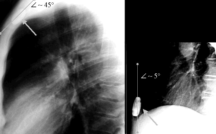 Das rechte Röntgenbild zeigt ein DSV, das im unteren Drittel des Brustkorbes implantiert ist. Es ist nahezu parallel zur senkrechten Körperachse. Entsprechend schaltet dieses Ventil auch korrekt zwischen Hoch- und Niederdruckventil um, wenn der Patient seine Körperposition ändert. Das linke Röntgenbild zeigt ein DSV, das an einer anderen Klinik implantiert wurde. Es wurde in der Nähe des Schlüsselbeins implantiert. Zur Körperlängsachse hat dieses Ventil einen Winkel von etwa 45°. Dieses Ventil kann nicht korrekt umschalten von der Nieder- zur Hochdruckseite, da selbst beim senkrechten Stehen, das Ventil noch in einer solchen Schräglage ist, dass die schaltende Tantalkugel den Abfluß aus dem Niederdruckventil nicht wie gewünscht verschließt. Nach korrekter Implantation des Ventils hatte dieser Patient keine Beschwerden mehr durch die Überdrainage, die vorher bestand.
