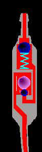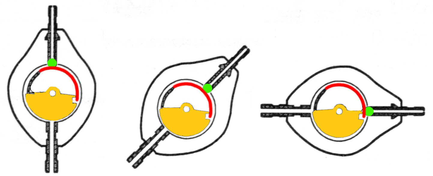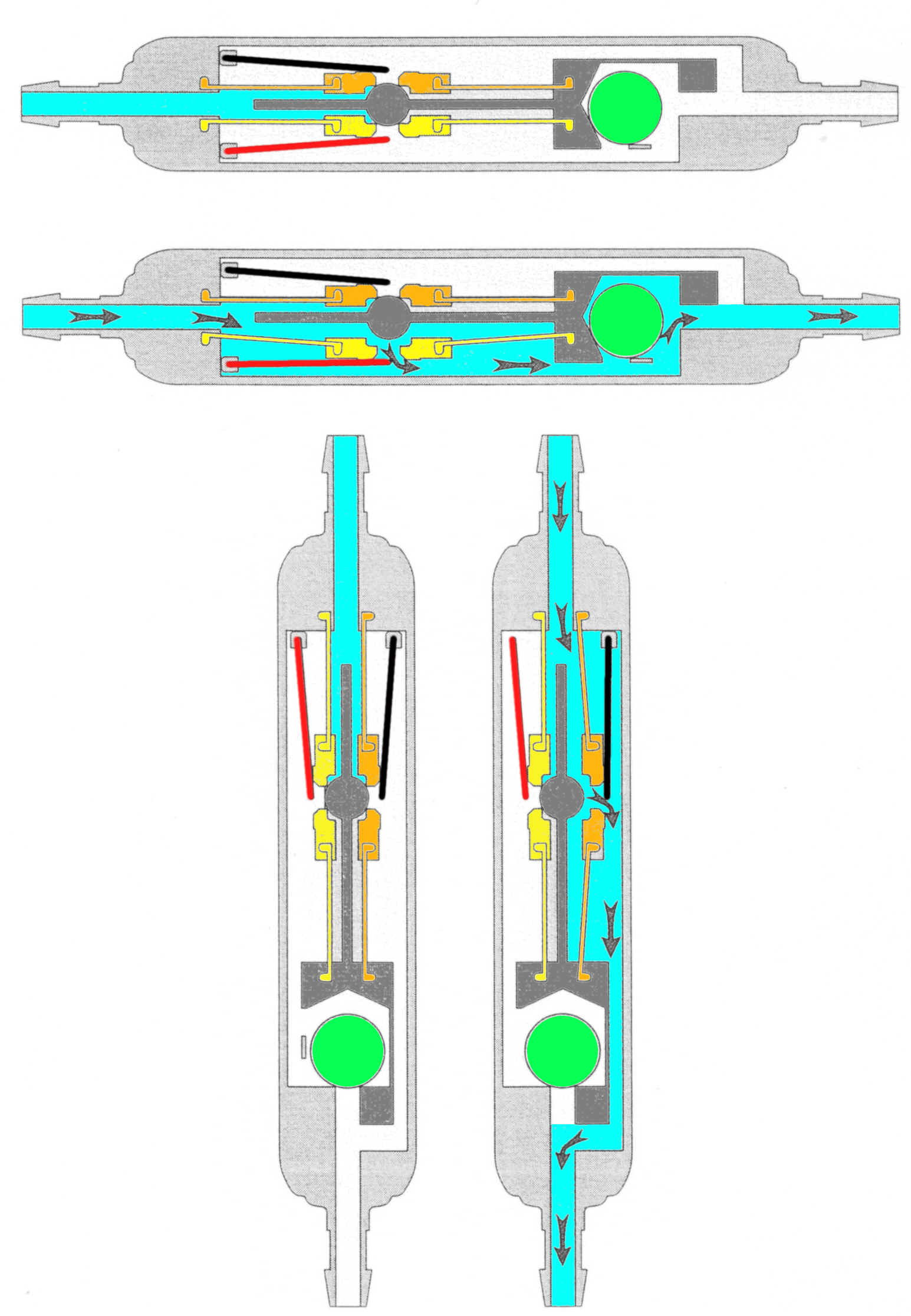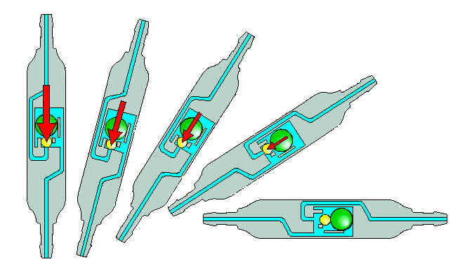 Erst mit dem Miethke Dual Switch Ventil wurde das erste Schwerkraftventil vom Switcher Typ vorgestellt, das auch in der Praxis funktionierte. Im Gegensatz zur Sophsya Konstruktion "merkte" das Ventil Änderungen der Körperlage nicht nur in einer Bewegungsachse sondern wie es sein muß in allen 3 Raumachsen. Beim DSV sind 2 Ventil, - ein Hochdruckventil für die stehende Position und ein Niederdruckventil für die liegende Position -, in einem Gehäuse untergebracht. Zwischen beiden Ventilen schaltet eine Tantalkugel (grün dargestellt) um. Das obige Bild illustriert die Funktion. Im Liegen ist das Niederdruckventil aktiviert. Sobald der Differentialdruck die Federkraft der (roten) Feder überwindet fließt Liquor, dabei passiert der Liquor eine Stelle, die für die Funktion dieses Ventils essentiell ist, die (grüne) Tantalkugel. Im Liegen ist sie aus dem Konus herausgefallen und bietet dem Liquor keinen Widerstand. Im Stehen dagegen ist die Situation völlig anders. Hier verschließt die Tantalkugel den Abflußkanal des Liquors aus dem Niederdruckventil. Einzig die Seite des Hochdruckventils bleibt dem Liquor um fließen zu können. Dieses ist möglich sobald die Federkraft (schwarz dargestellt) des Hochdruckventils überwunden wird. Man wird sich nun fragen und was ist mit den Zwischenpositionen ? Ein Patient kann sich ja nicht immer nur senkrecht aufrecht halten oder absolut flach liegen. Vom Konstruktionsprinzip des Ventils könnte man meinen, dass dieses Ventil nur für diese beiden Extrempositionen konzipiert ist. Dies ist aber keineswegs der Fall. In allen Zwischenpositionen flattert die Tantalkugel hin und her. Sie kippt nämlich bei Schräghaltung des Körpers etwas aus ihrer Position über dem Konus und läßt damit den Liquorfluß über das Niederdruck zu. Ist der Liquorfluß aber hoch, so preßt dieser die Kugel wiederum in den Konus und deaktiviert damit das Niederdruckventil. Der Liquorfluß in den Zwischenpositionen wird also die die zeitlich unterschiedliche Aktivierung von Hoch- und Niederdruckventil bestimmt. Sowohl der Winkel in dem sich das Ventil zur Senkrechten befindet, wie auch die Geschwindigkeit des fließenden Liquors definieren dabei, ob Hoch- oder Niederdruckventil aktiviert sind.