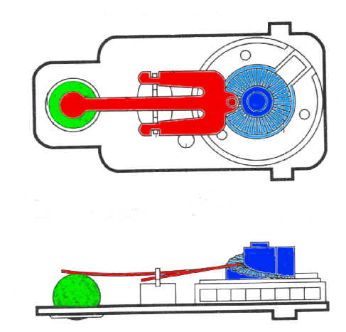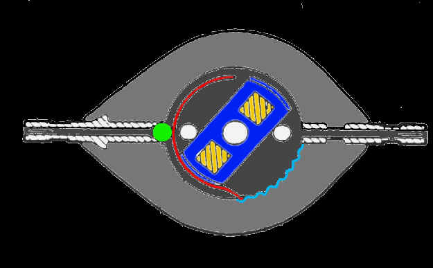 Diese Abbildung stellt den Aufbau des einstellbaren Codmann-Hakim Ventils dar. Auf einer wendeltreppenartigen Helix (blau dargestellt), die um ihr eigenes Zentrum rotiert, liegt eine Blattfeder (rot dargestellt auf. Durch ein perkutan aufgebrachtes rotierendes Magnetfeld kann die Vorspannung der Blattfeder, die wiederum einen Kugel-Konus Mechanismus bedient, variiert werden. Der wesentliche Unterschied zur Sophysa Konstruktion ist, dass über dem Zentrum der Helix ein schnell rotierendes Magnetfeld anliegen muß, um eine Veränderung des Öffnungsdrucks des Ventils herbei zu führen. Die Wahrscheinlichkeit, dass dieser Ventiltyp durch Magnetfelder, die uns im Alltag umgeben, verstellt wird ist daher geringer als bei der Sophysa Konstruktion. Aber auch dieses Ventil kann von Magnetfeldern (z.B. Kopfhörern) des täglichen Lebens verstellt werden. Vom Hersteller werden Magnetfelder mit einer Stärke von 60 Gauss (= 6 milli Tesla) und mehr als bedenklich angegeben. Derart starke Magnetfelder finden sich durchaus in unser unmittelbaren Umgebung oder am Arbeitsplatz. Der Zugführer einer Elektrolokomotive wäre hier beispielsweise betroffen. Es muß also das Umfeld des Patienten, der ein Ventil erhalten soll kritisch auf derartige Störgrößen hin abgecheckt werden, um Problem im voraus zu vermeiden. Ein Magnetfeld das jedoch in jedem Fall erwähnt werden muß, ist die Kernspintomographie. Auch das Codmann Ventil ist in 40% d.F. nach einem MRT (meist aber in geringem Maße) verstellt. Es ist daher notwendig, dass Patienten mit einstellbaren Ventilen unmittelbar nach Durchführung des MRT die Einstellung ihres Ventils überprüfen lassen. Da dies jeweils eine Röntgenaufnahme des Schädels erfordert, kann es im Laufe von Jahren doch zu einer nicht als völlig unbedeutend einzustufenden Strahlenbelastung der Betroffenen kommen. Dieses Problem ist ein Haupt-Kritikpunkt, den Neurochirurgen an diesem System haben.
